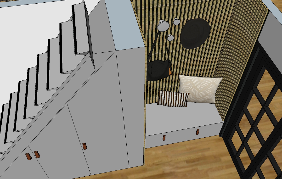 Een hal is een verzamelplek voor jassen, tassen, schoenen en allerlei andere spullen die je dagelijks nodig hebt. Een recept voor rommel dus! Hoe fijn is het als je al deze spullen netjes in een kast kunt opbergen, zodat ze achter een deur verstopt zitten? Bij dit project kozen we ervoor om de open trap dicht te maken, zodat er een kastenwand onder de trap kon worden geplaatst. Naast de kastenwand ontwierp ik een gezellig hoekje waar je even kunt zitten om je schoenen aan te trekken. Praktisch én leuk!
