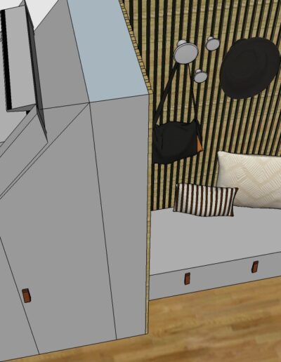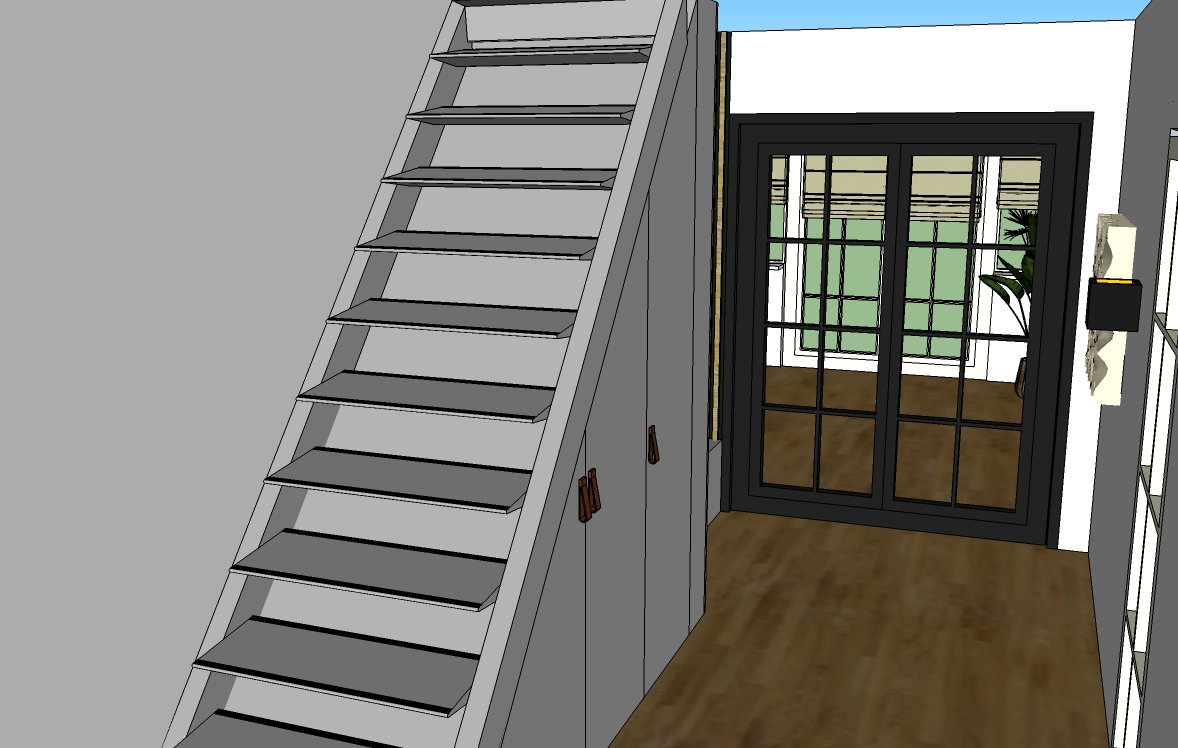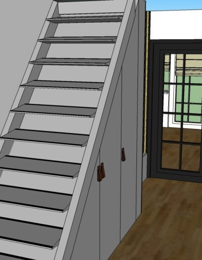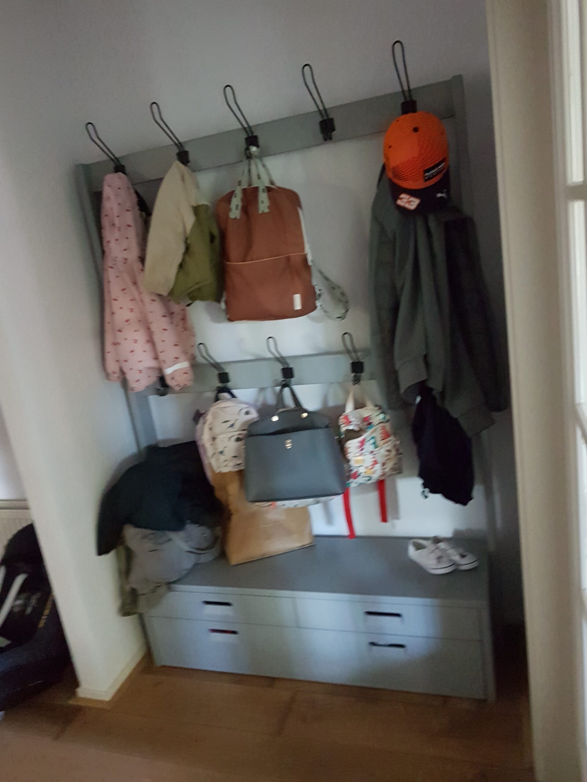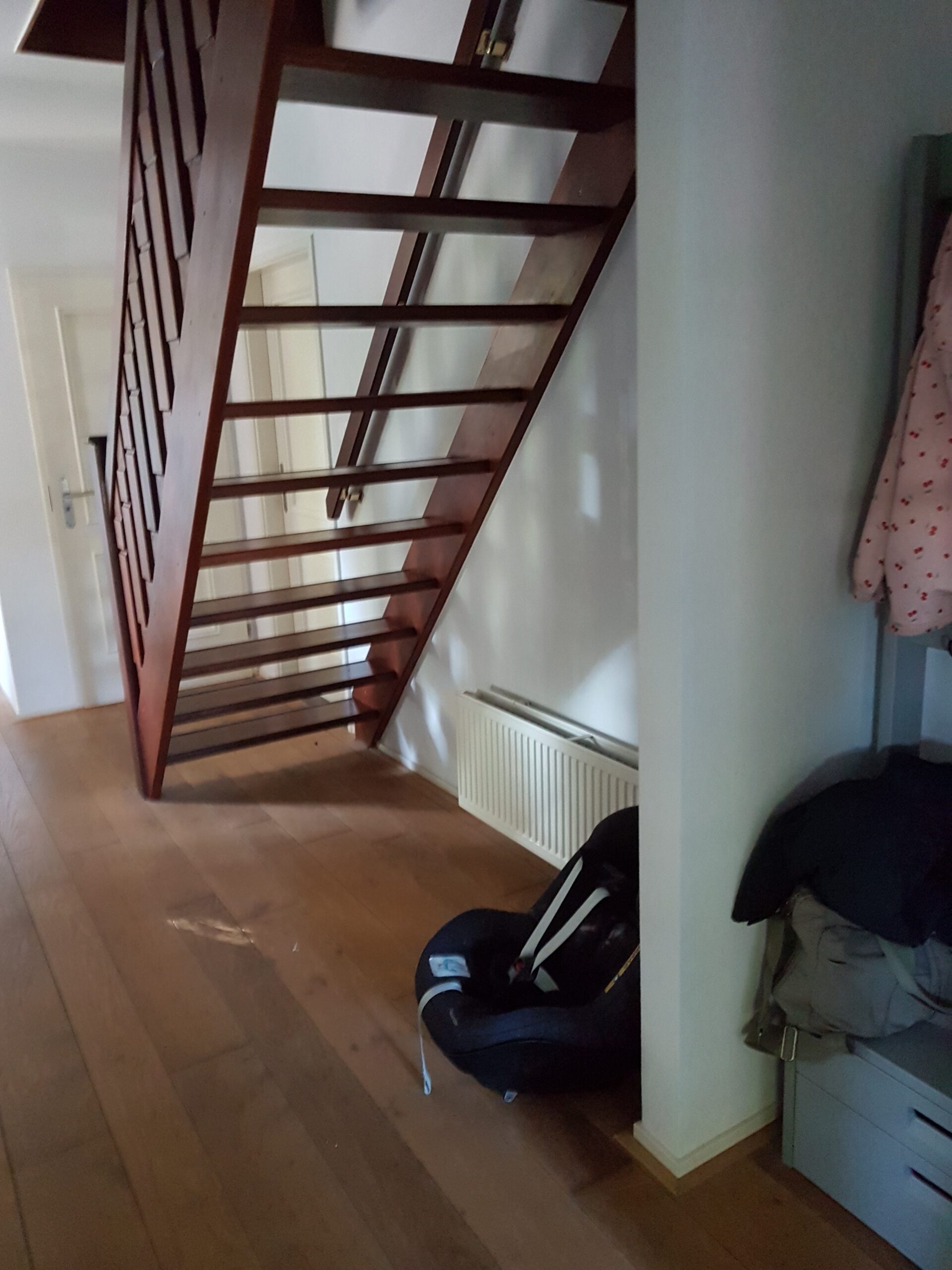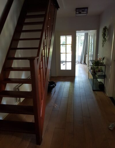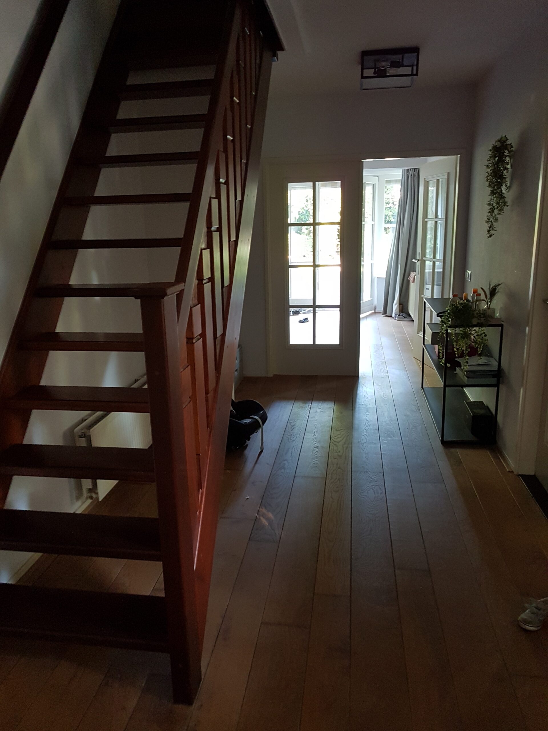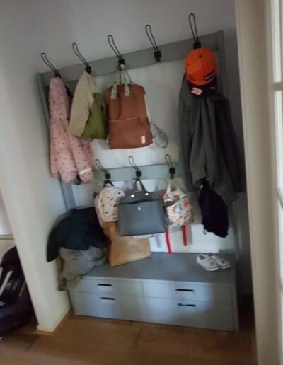 Een hal is een verzamelplek voor jassen, tassen, schoenen en allerlei andere spullen die je dagelijks nodig hebt. Een recept voor rommel dus! Hoe fijn is het als je al deze spullen netjes in een kast kunt opbergen, zodat ze achter een deur verstopt zitten? Bij dit project kozen we ervoor om de open trap dicht te maken, zodat er een kastenwand onder de trap kon worden geplaatst. Naast de kastenwand ontwierp ik een gezellig hoekje waar je even kunt zitten om je schoenen aan te trekken. Praktisch én leuk!